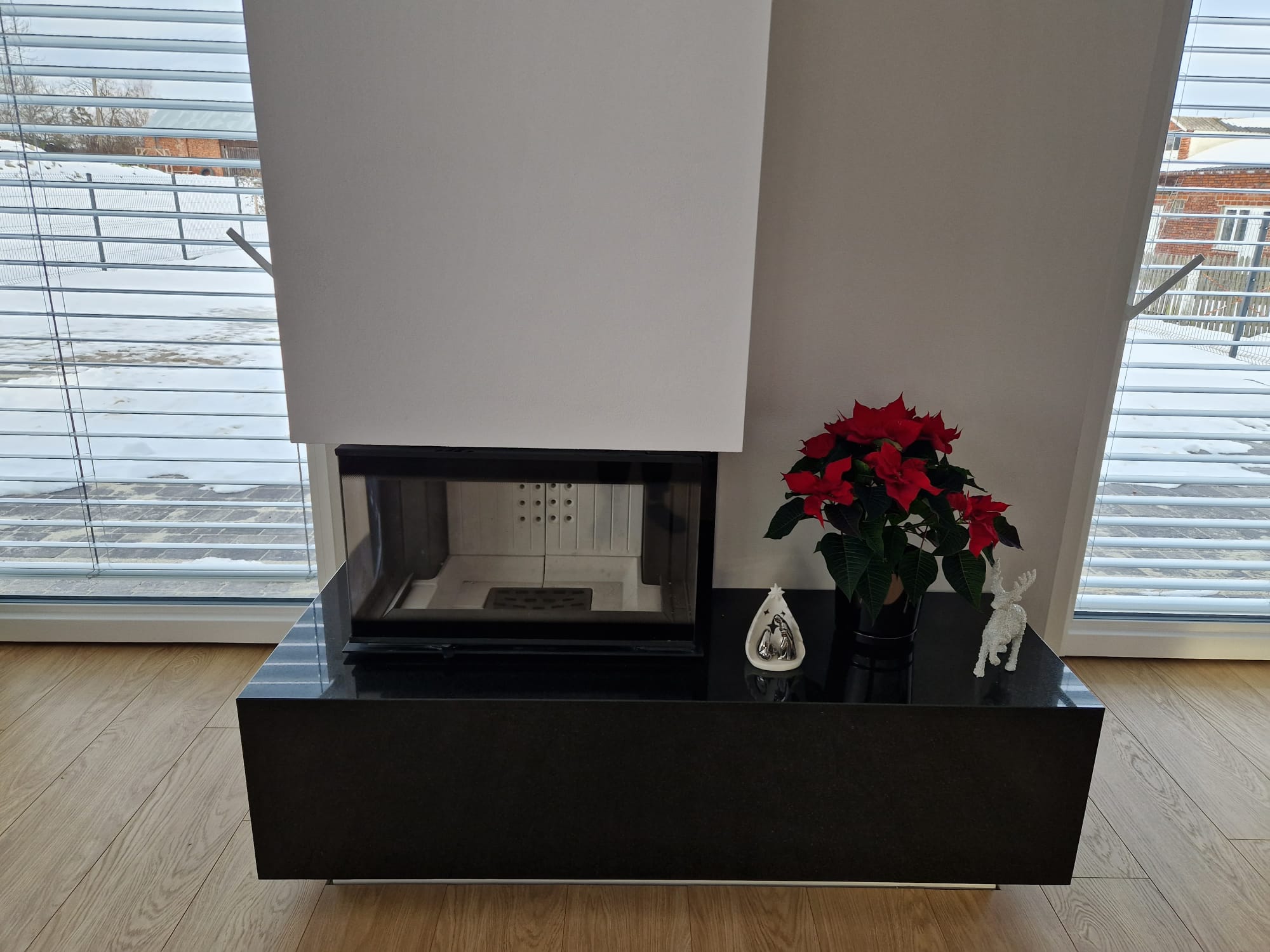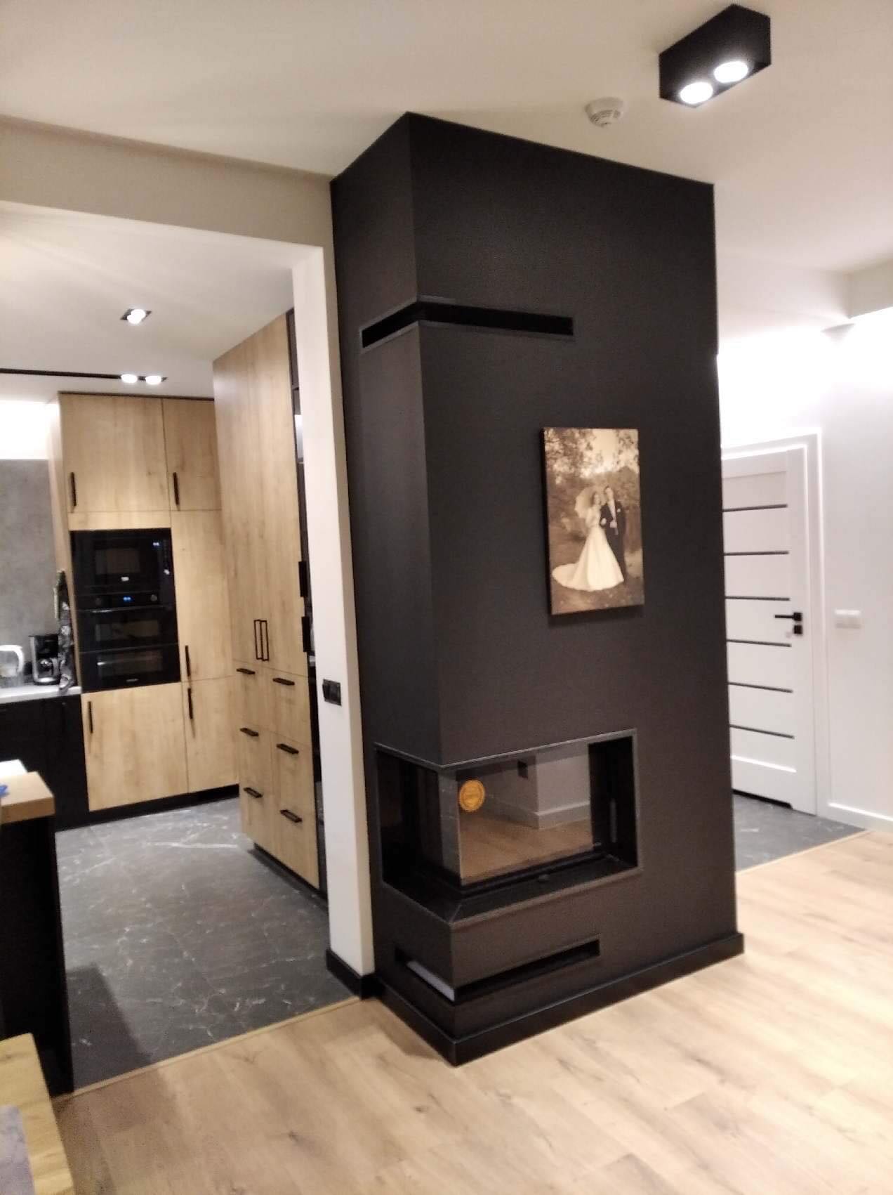 W realizacji wykorzystano wkład kominkowy marki DefroHome oraz granit absolut black.