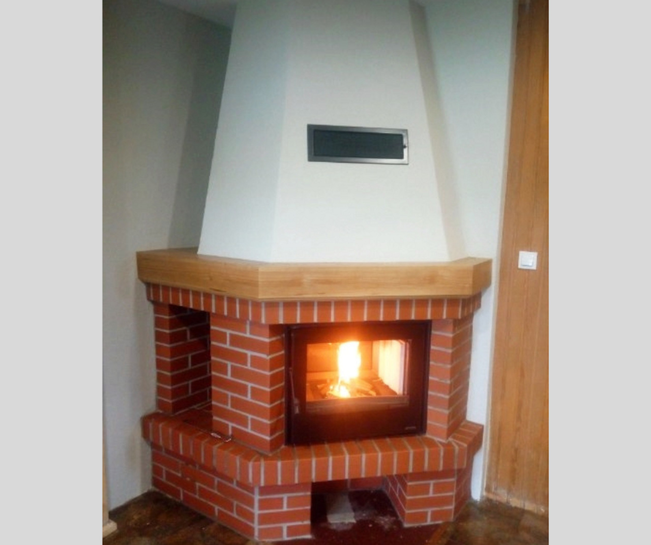 Kominek narożny w zabudowie z cegły