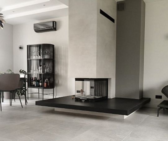 W realizacji wykorzystano narożny wkład kominkowy na drewno marki Brunner oraz spieki kwarcowe Laminam Pietra Grey.