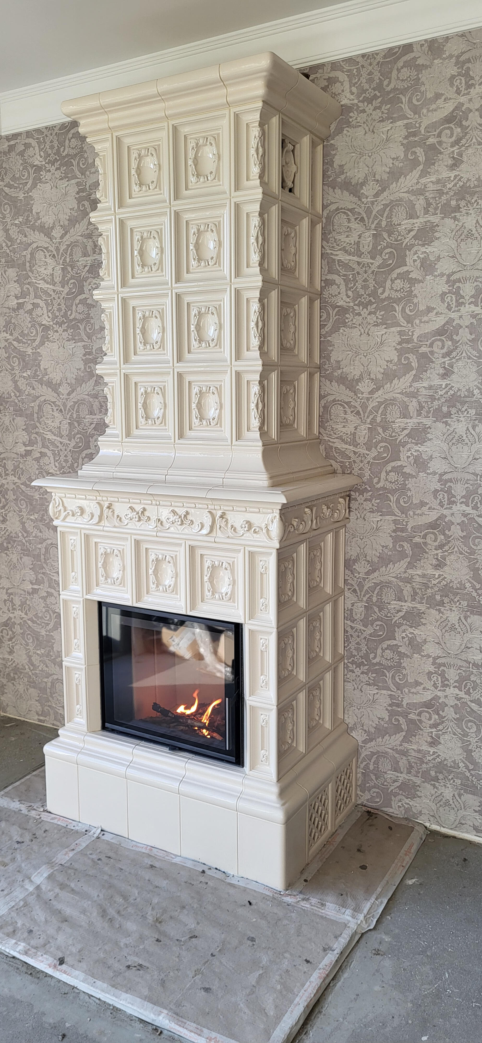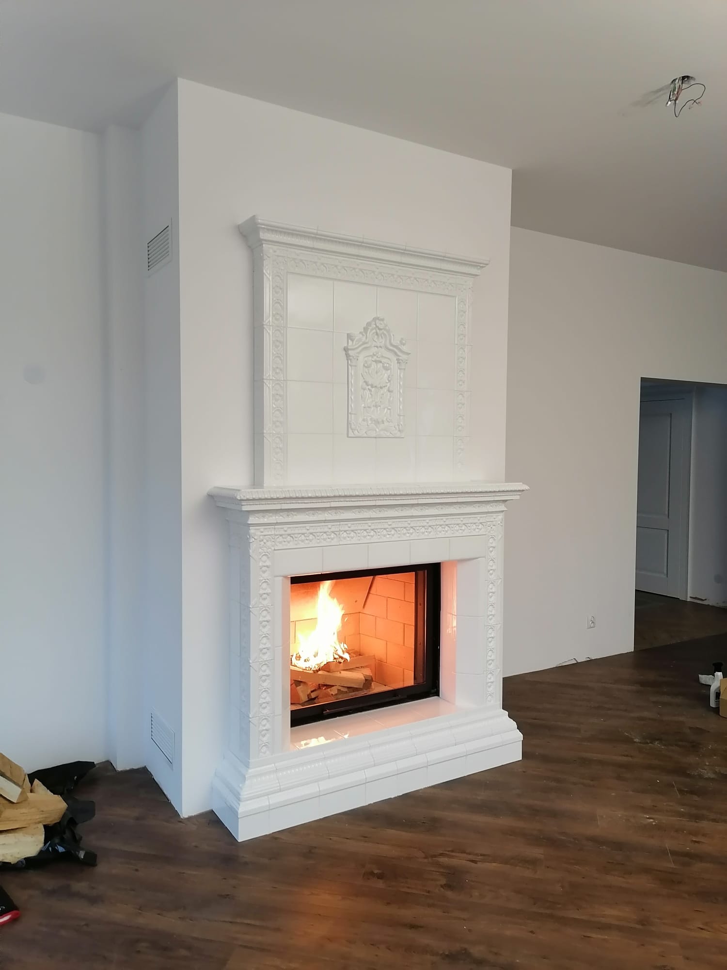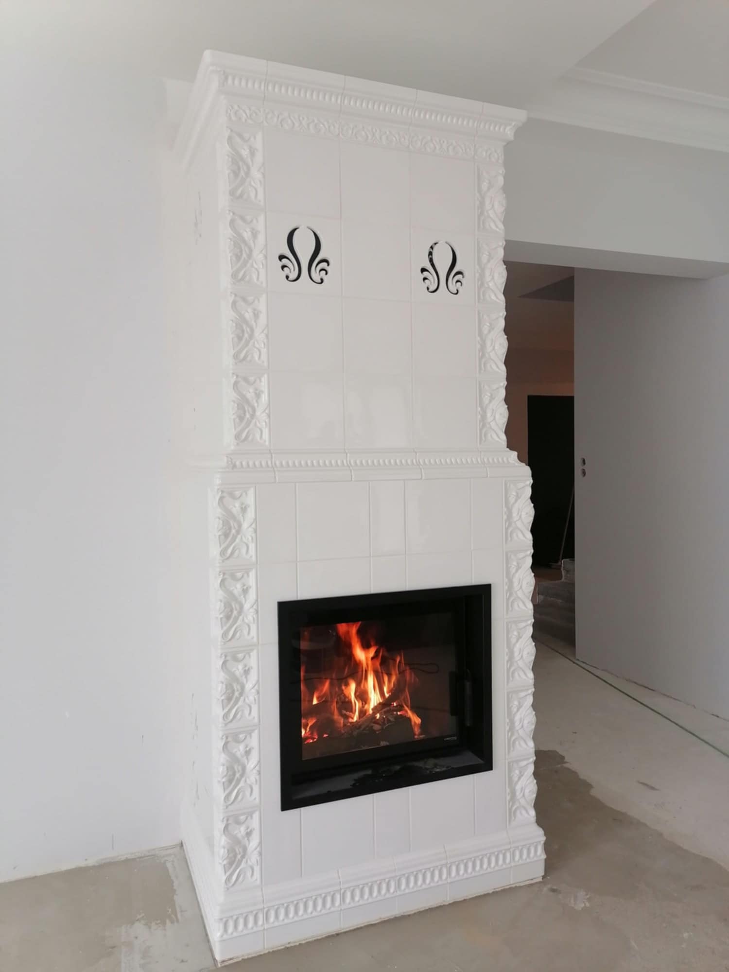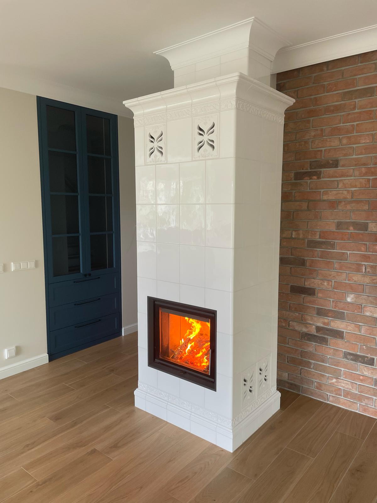 Kominek został wykończony kaflami wykonanymi na indywidualne zamówienie z Manufaktura Pałac Nakomiady .