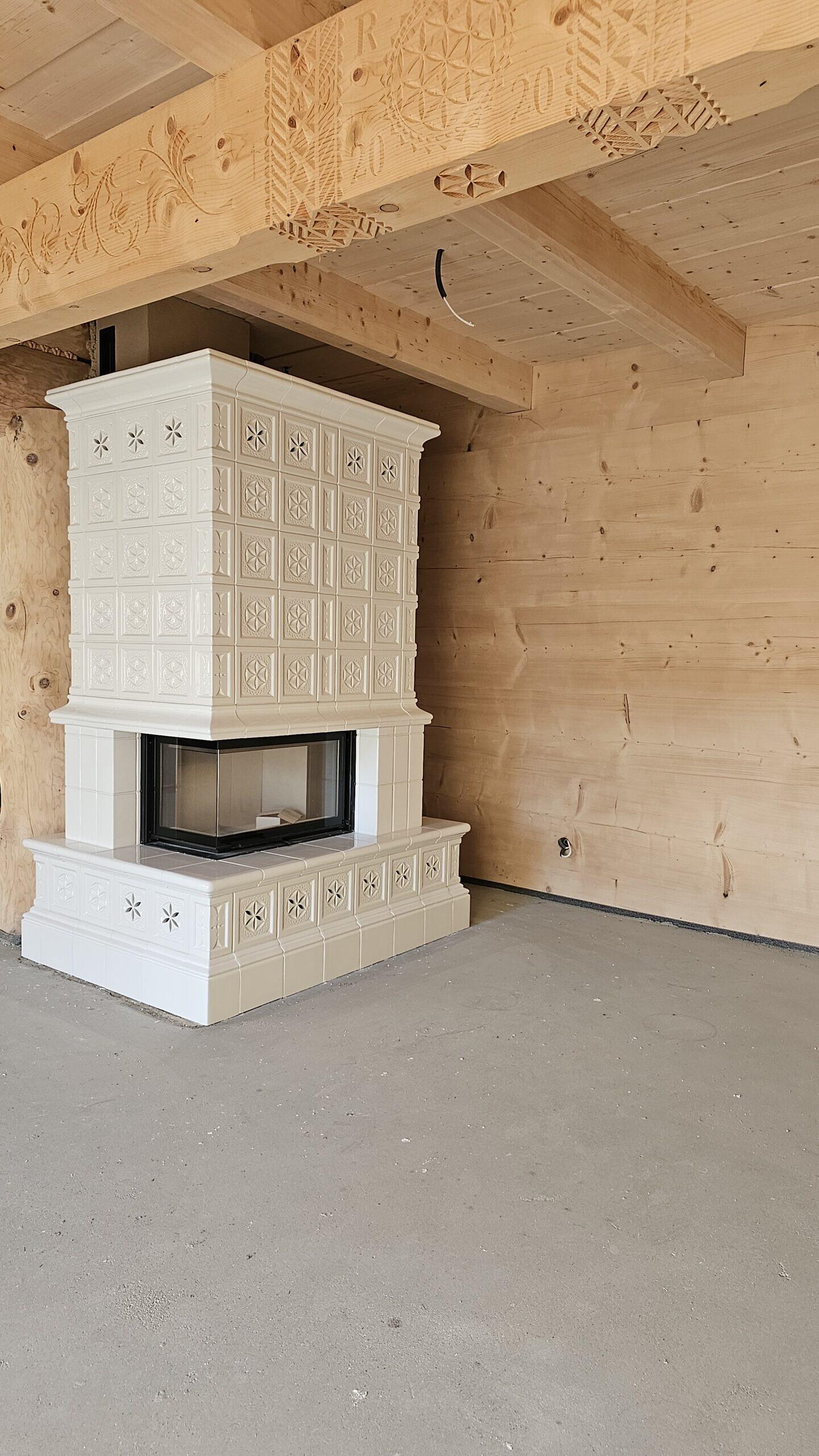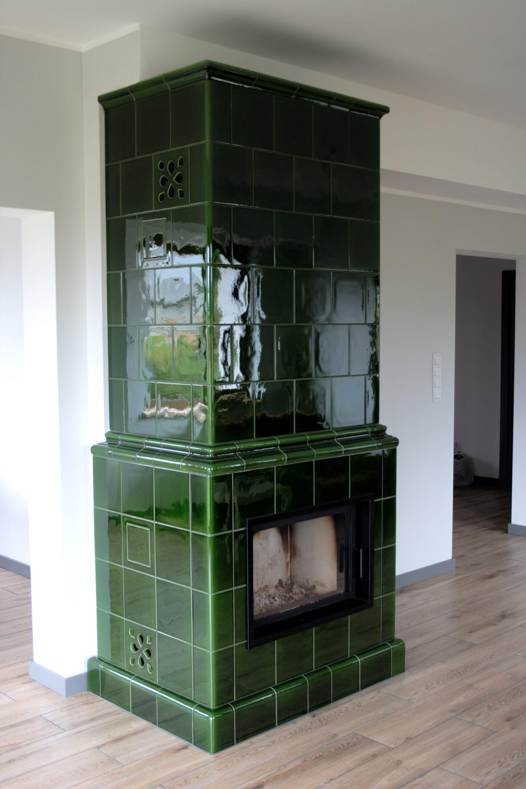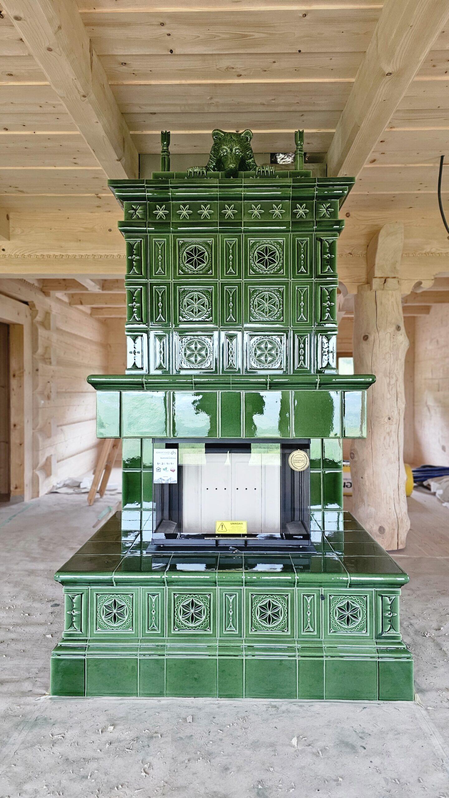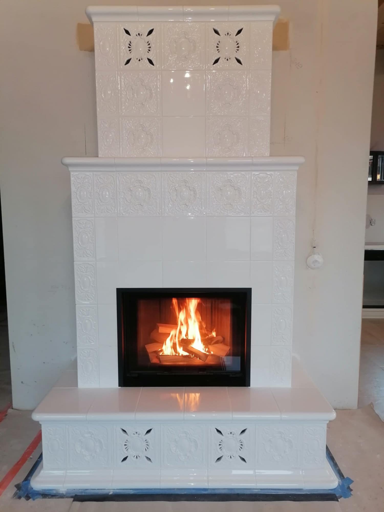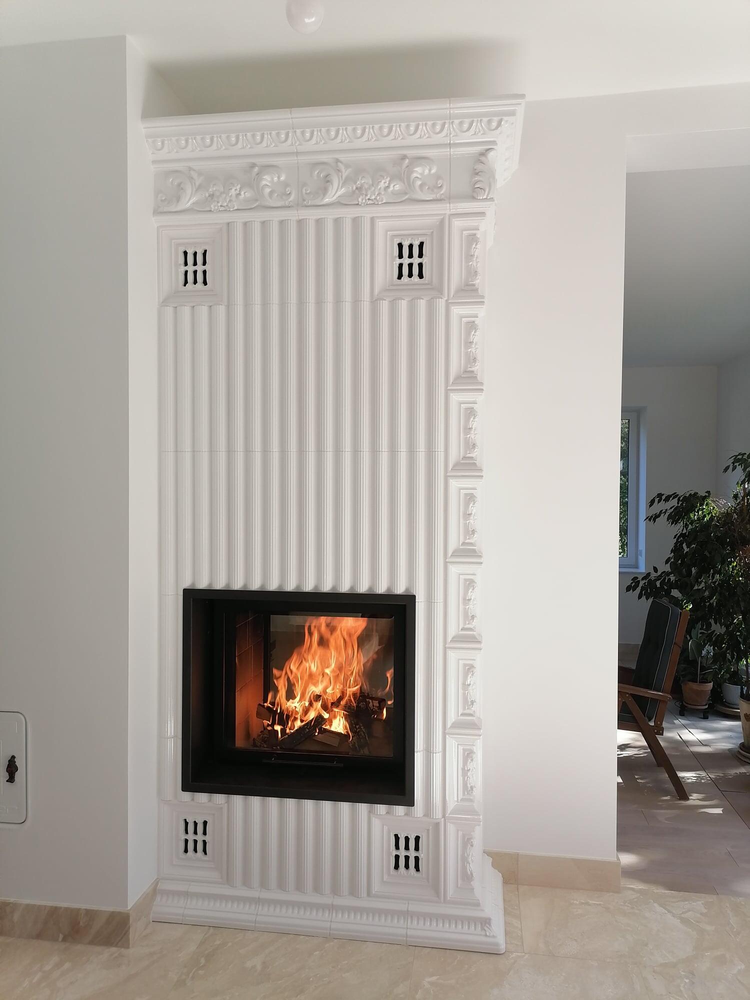 Kominek został wykończony kaflami wykonanymi na indywidualne zamówienie z Manufaktura Pałac Nakomiady .
