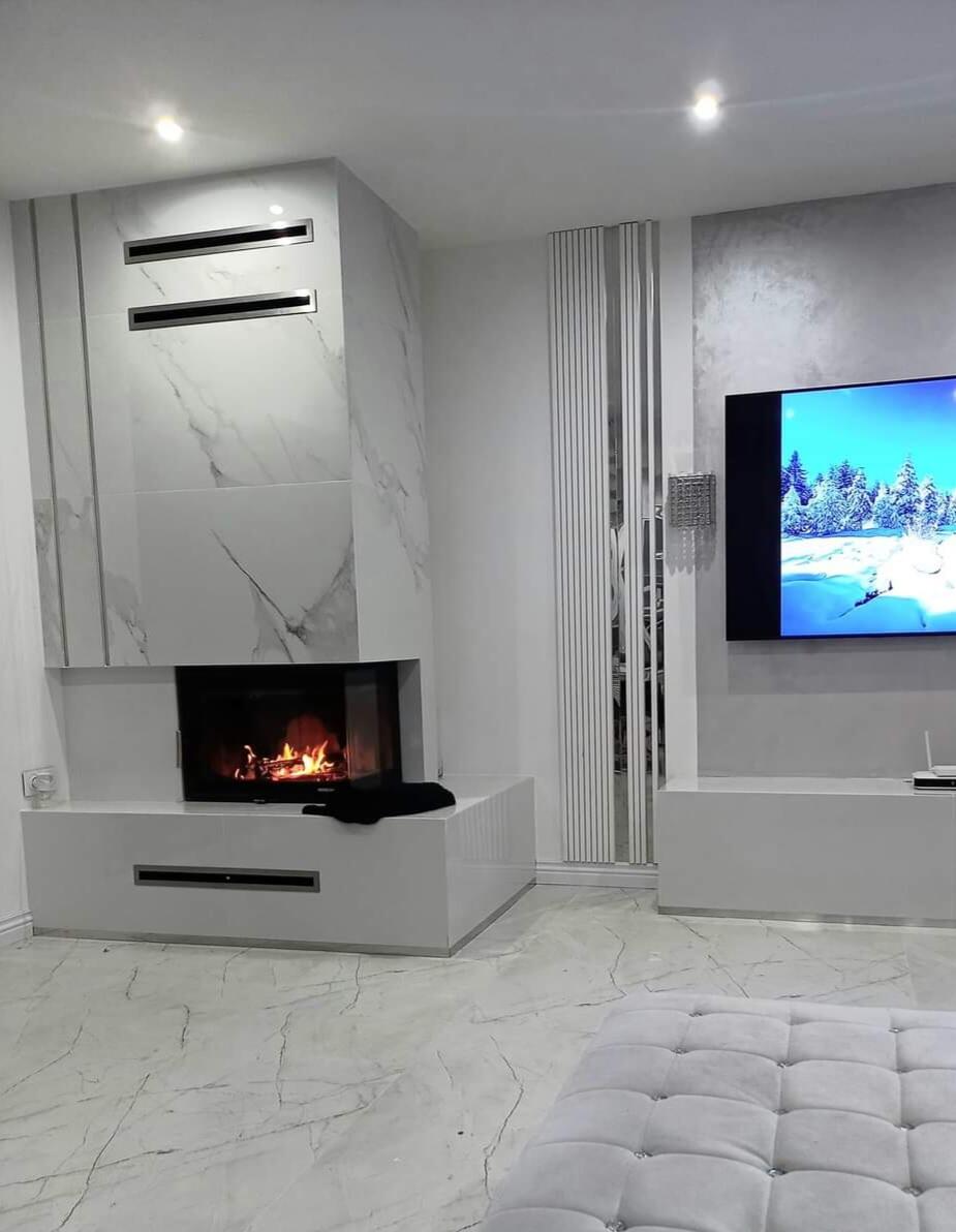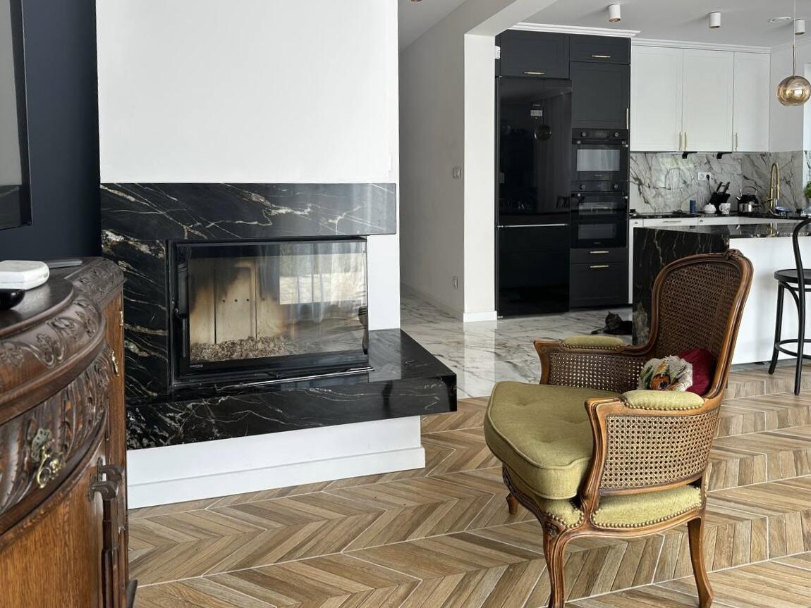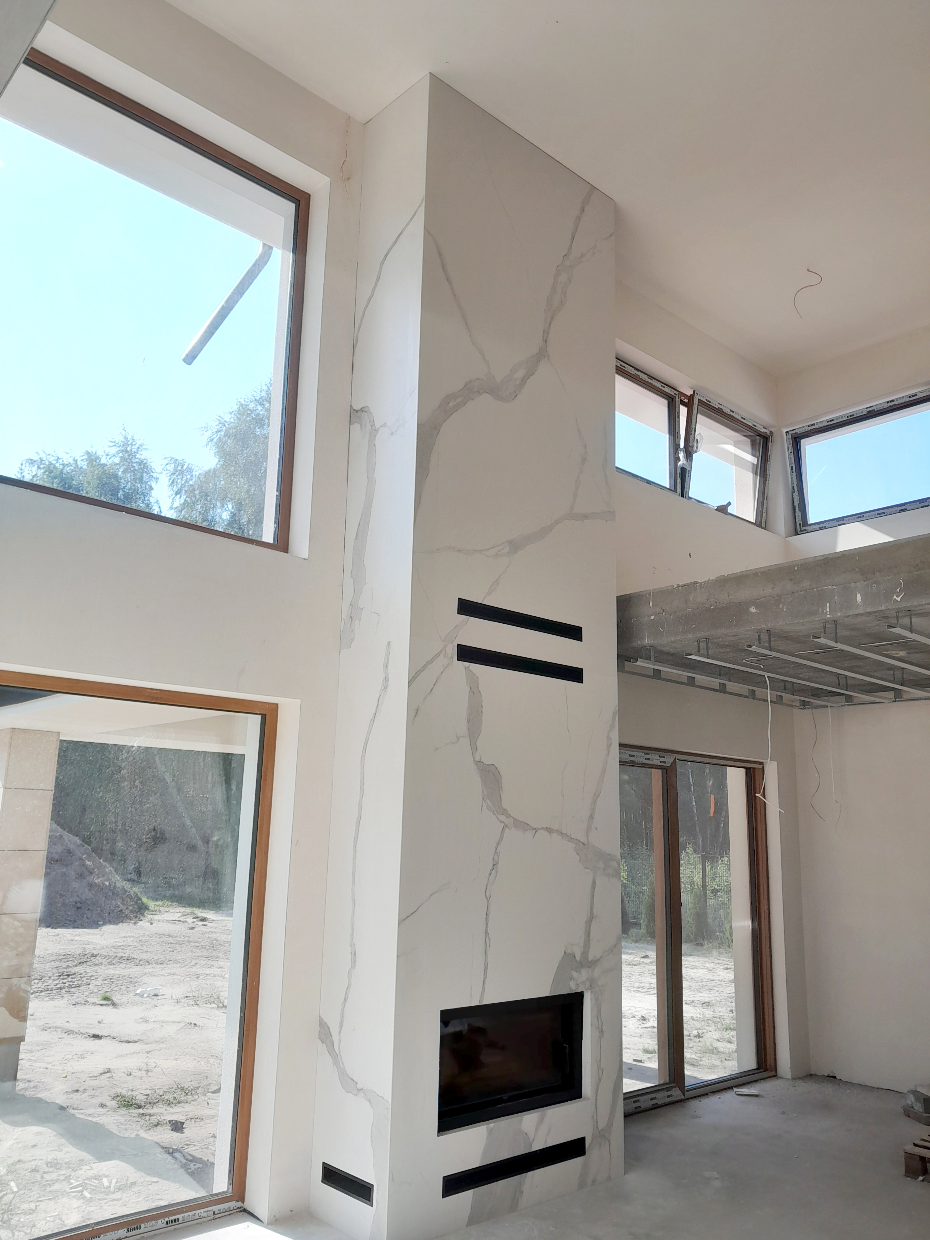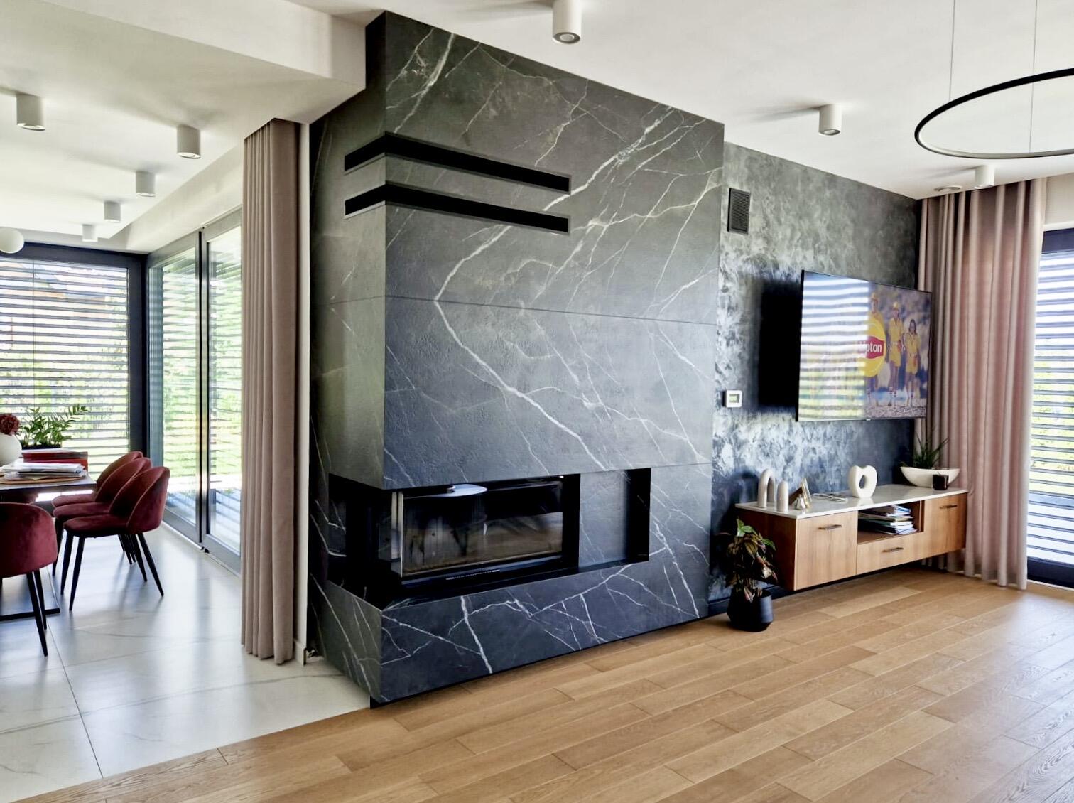 Kominek z wymiennikiem wodnym wykończony jest marmurem z zakładu kamieniarskiego Stadnicki - Szybiak.