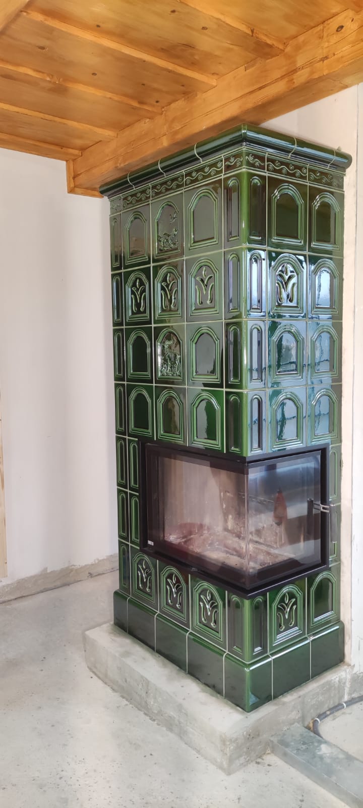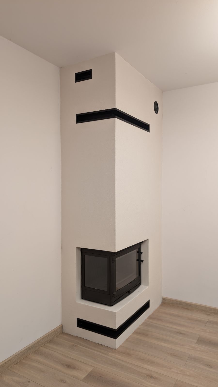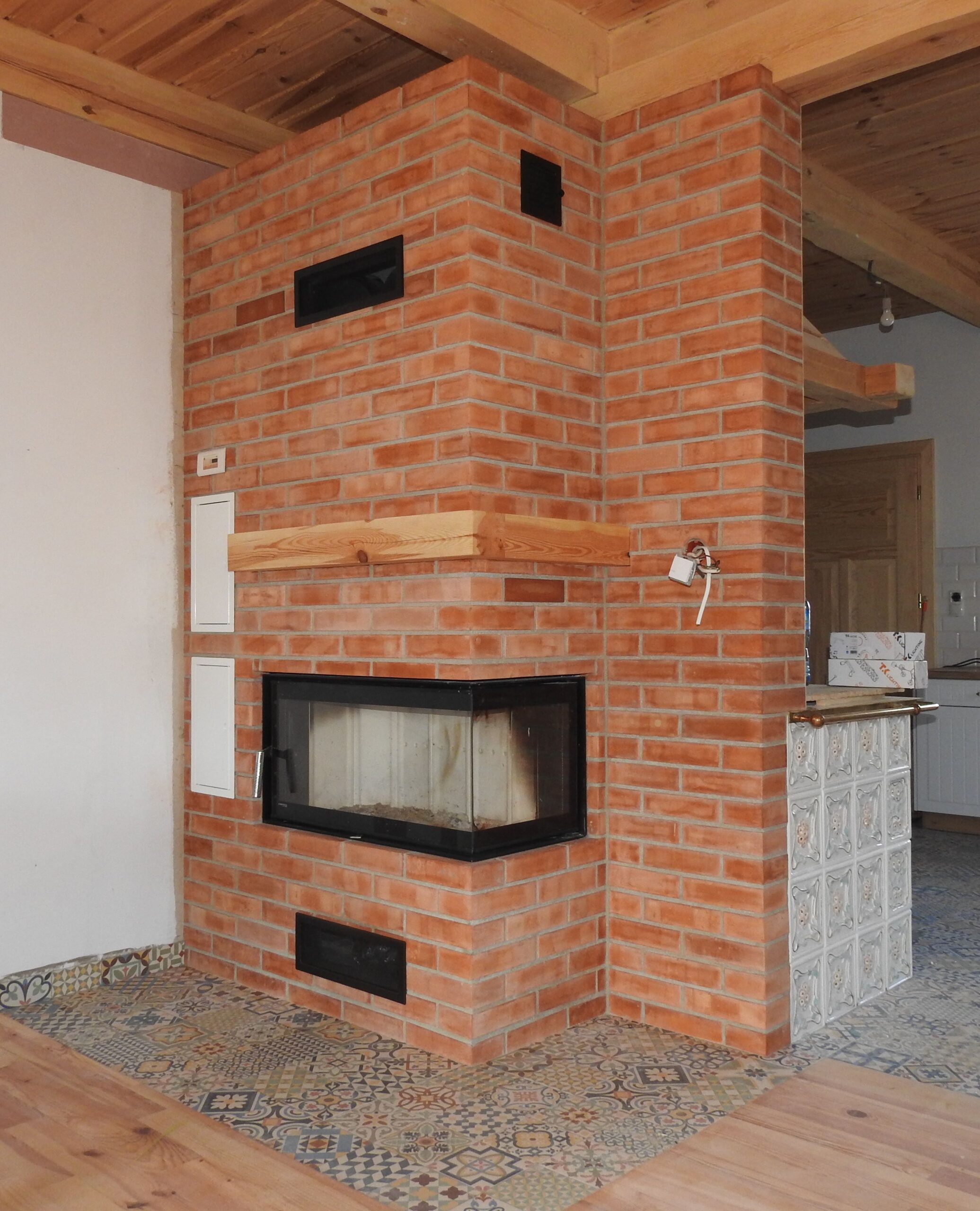 Kominek tunelowy wykonany tradycyjnym zduńskim sposobem tworząc ogromny mebel grzewczy z dużą ilością akumulacji. Wykończony został kaflami z Kaflarni Kafel - Kar.