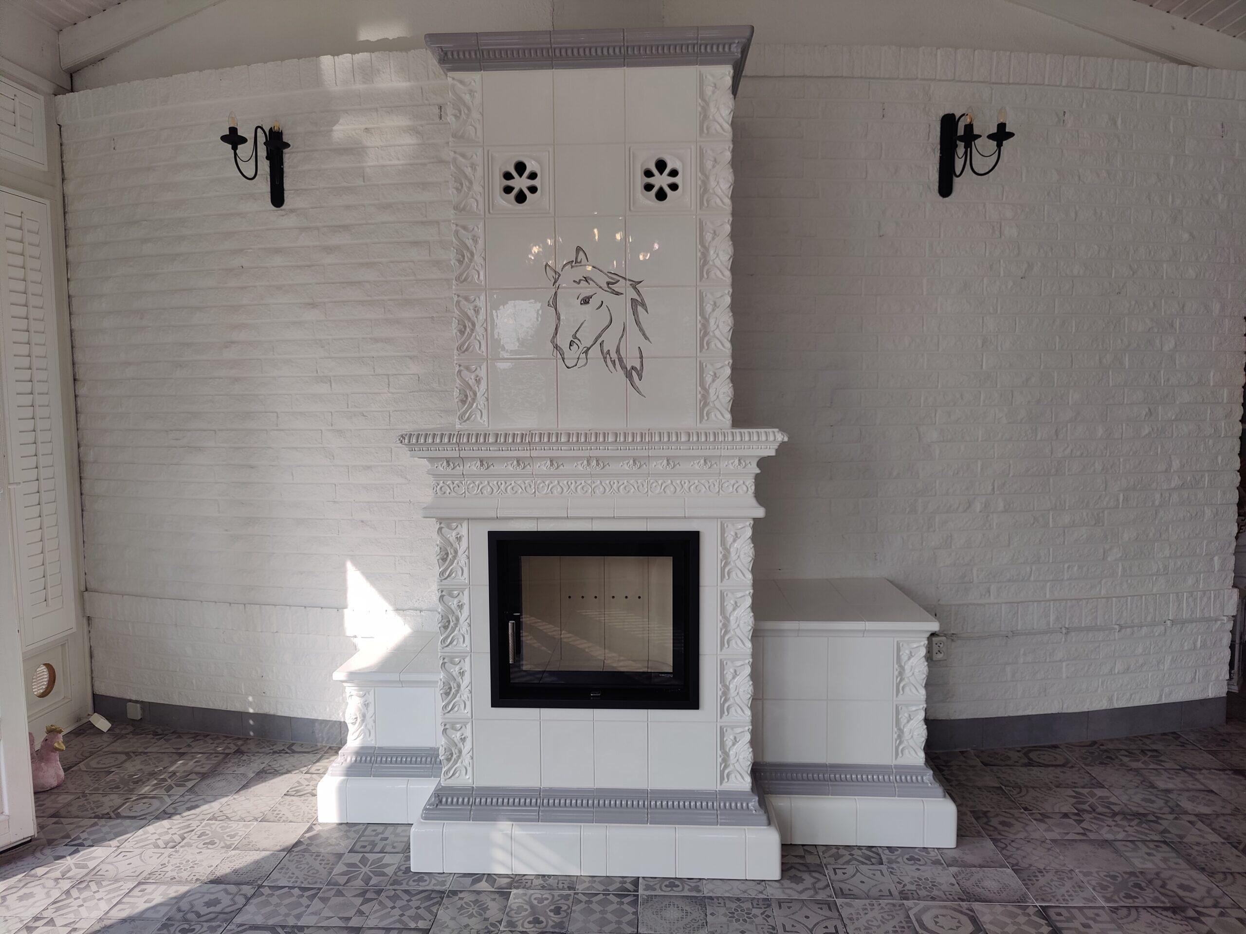 Kominek kaflowy jest wykończony kaflamiw kolorze białym i szarym z połyskiem. Na 9 kaflach jest ręcznie namalowany portret konia. Kafle pochodzą z kaflarni Kafel-Kar.