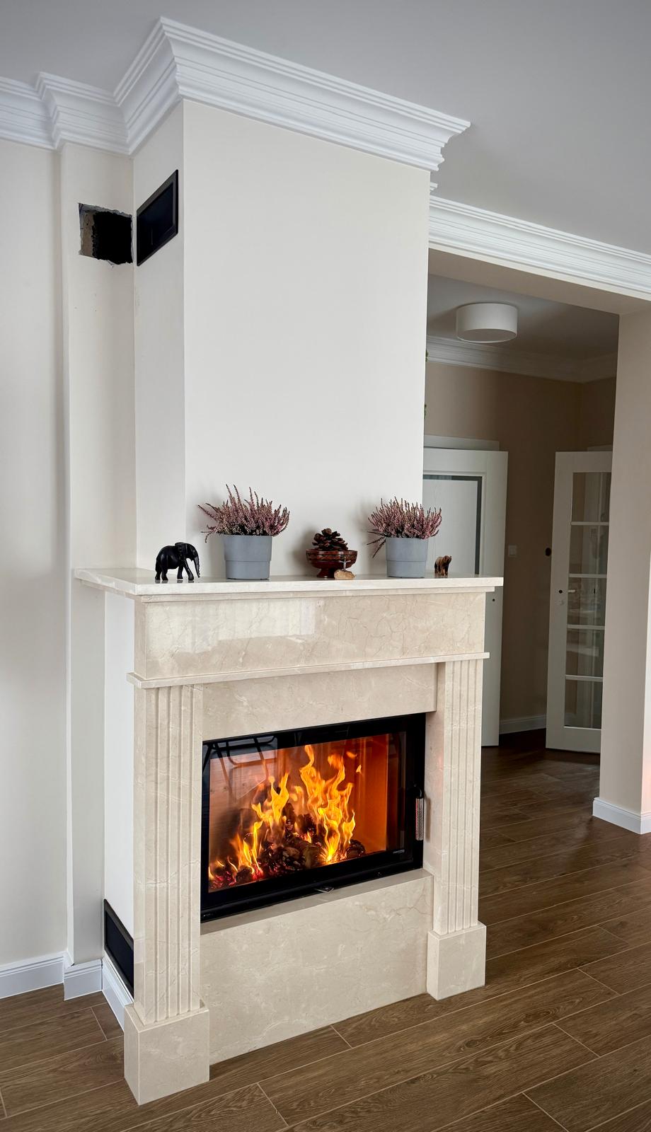Kominek dwubryłowy w zabudowie portalowej, wykończony jest hiszpańskim marmurem Crema Marfil.