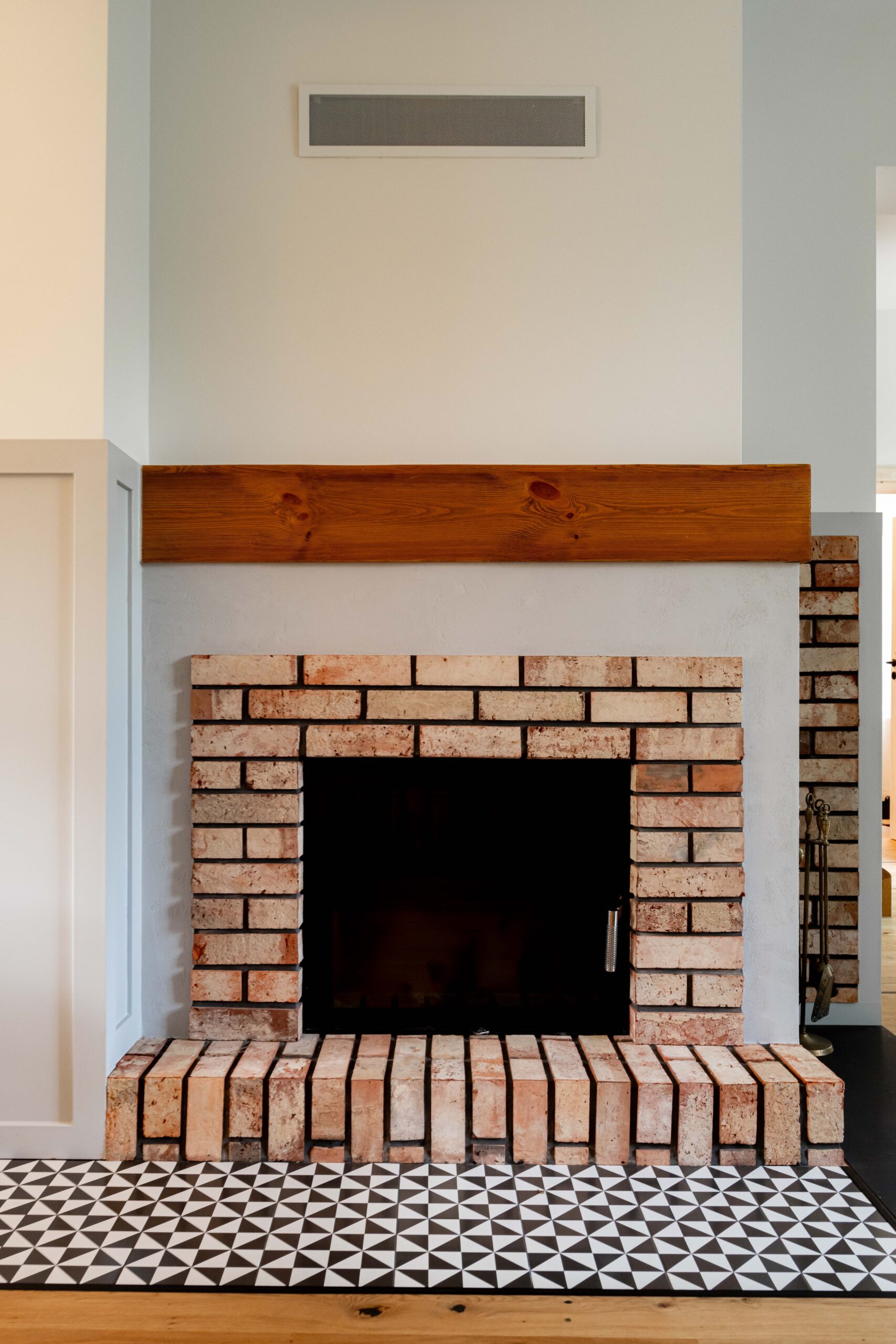 Kominek jest wykończony cegłą, posiada również drewnianą belkę.