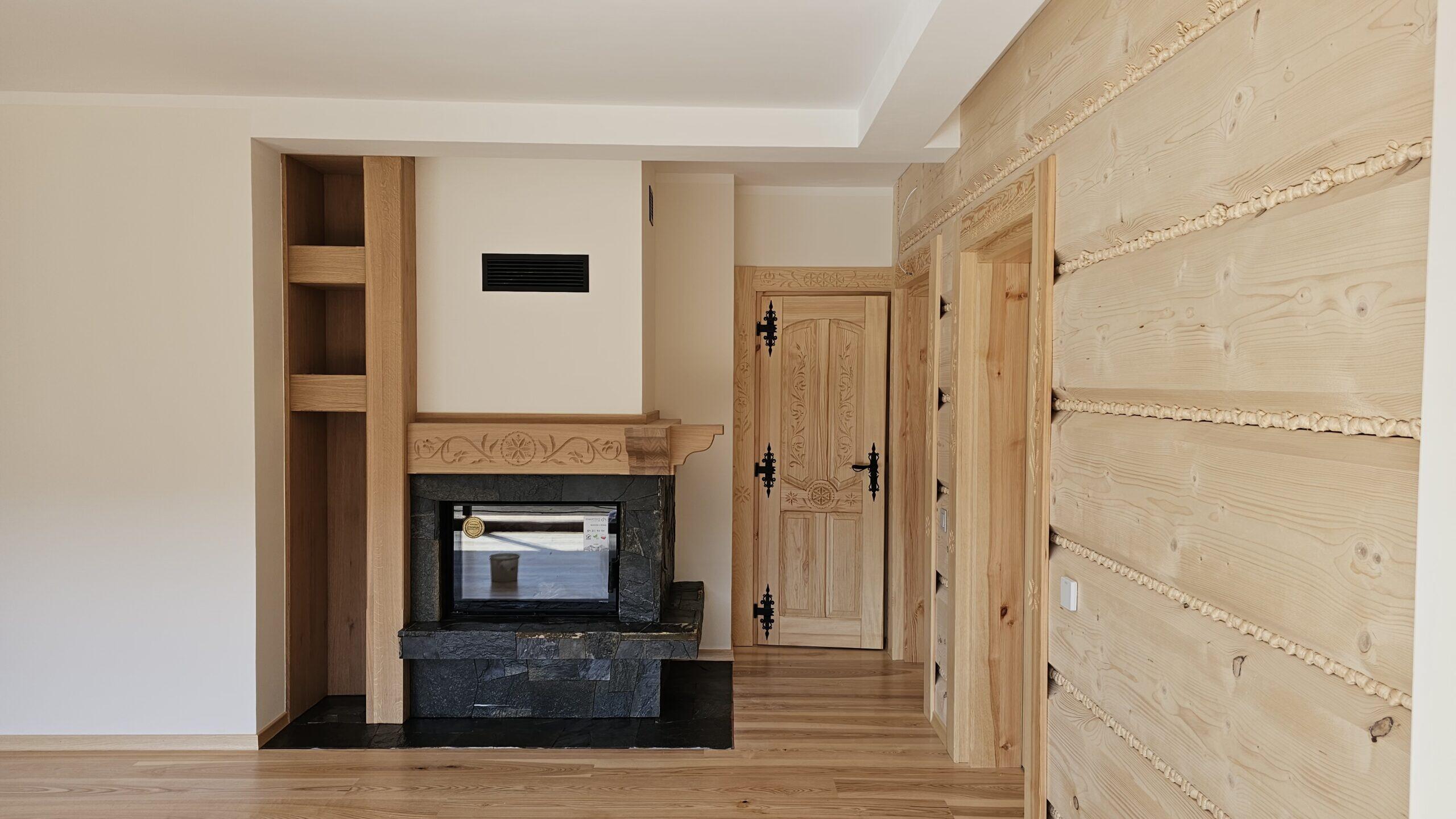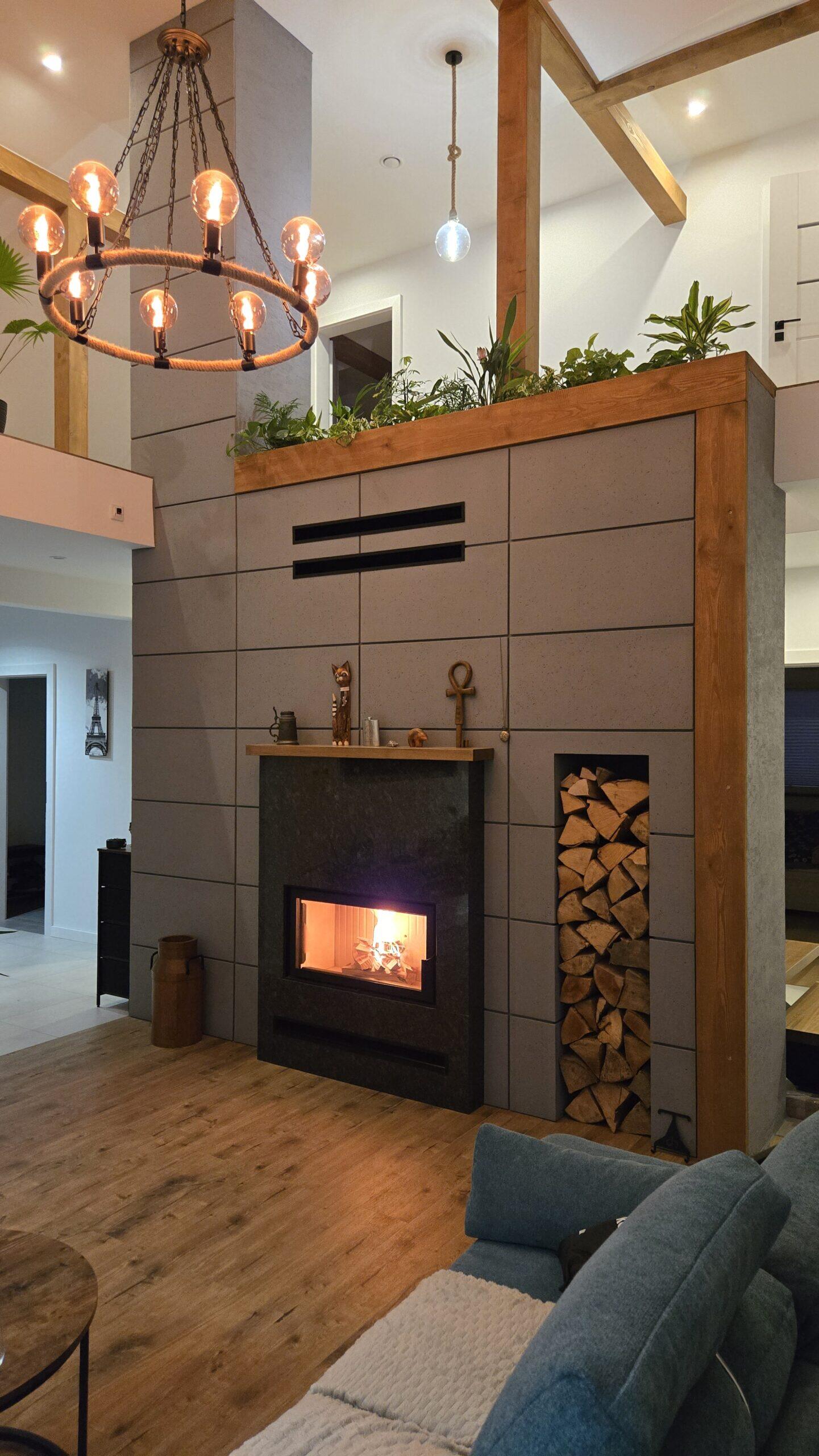 Kominek wykonany na podstawie indywidualnego projektu, został umieszczony w drewnianym portalu.