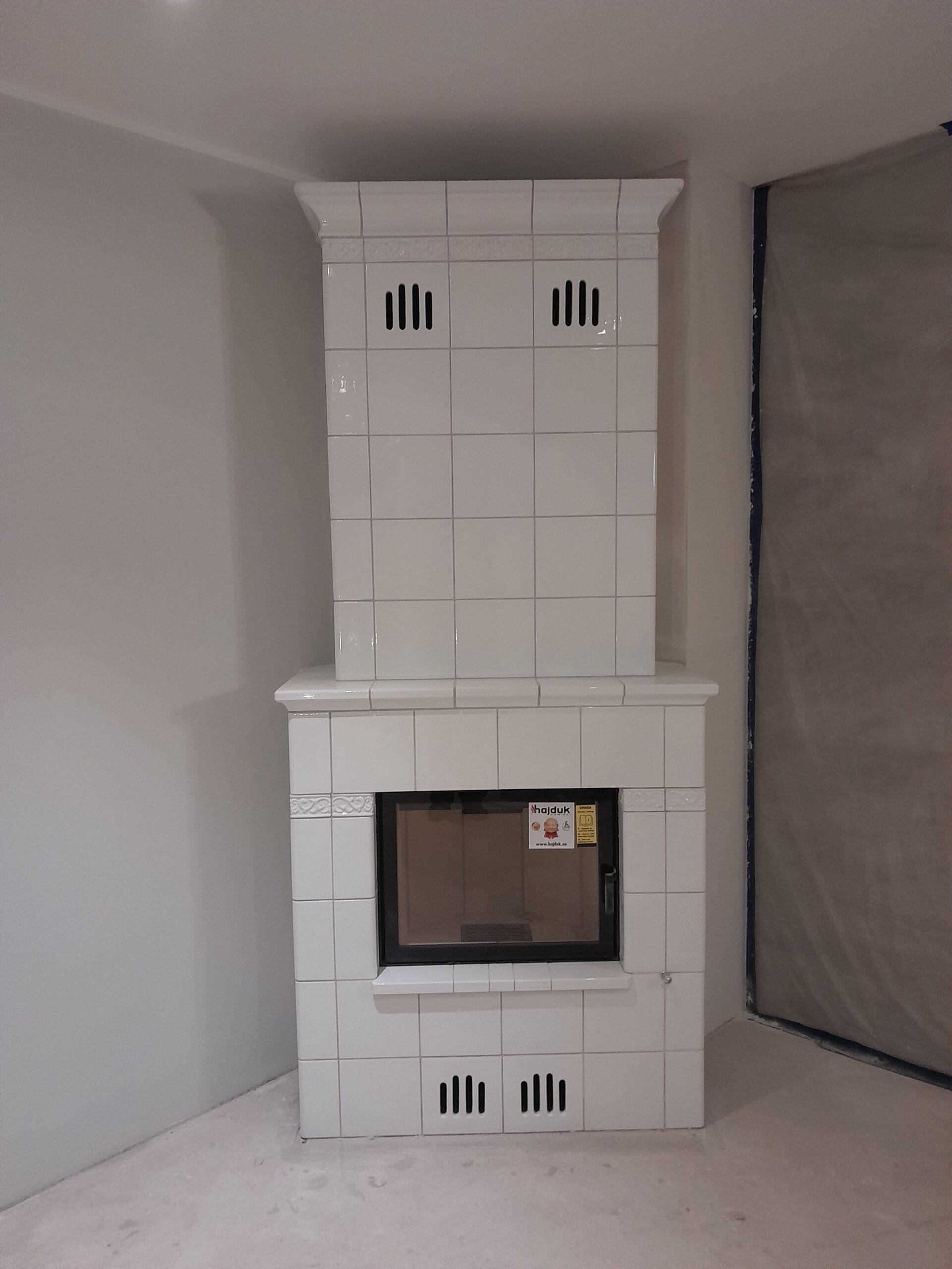 Kominek wykończony białymi kaflami z Kaflarni Kafel- Kar.