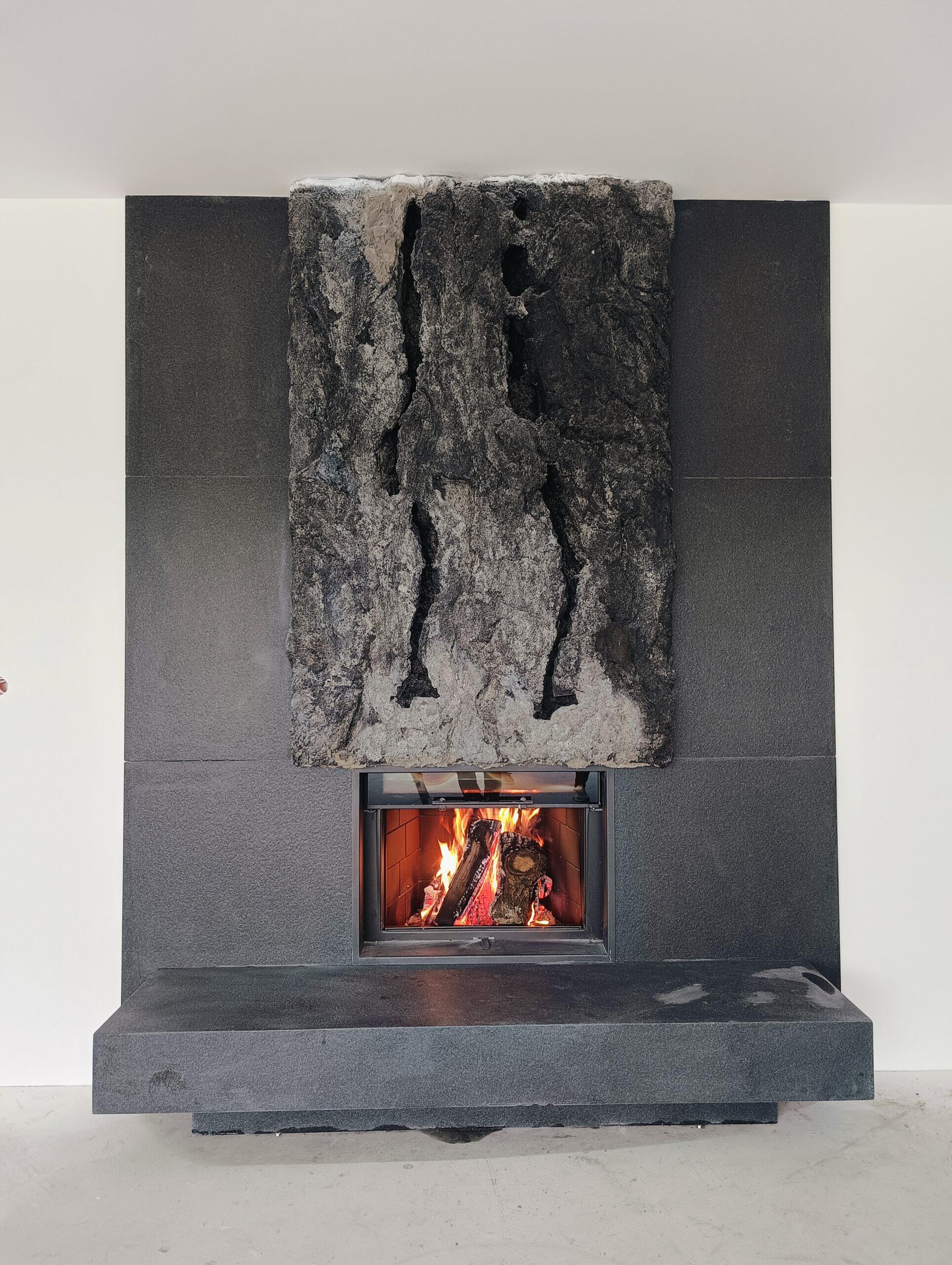 Modernistyczny kominek wykończony ogniotrwałymi elementami wykonanymi z granitu Absolutne Black (na podobieństwo skały).