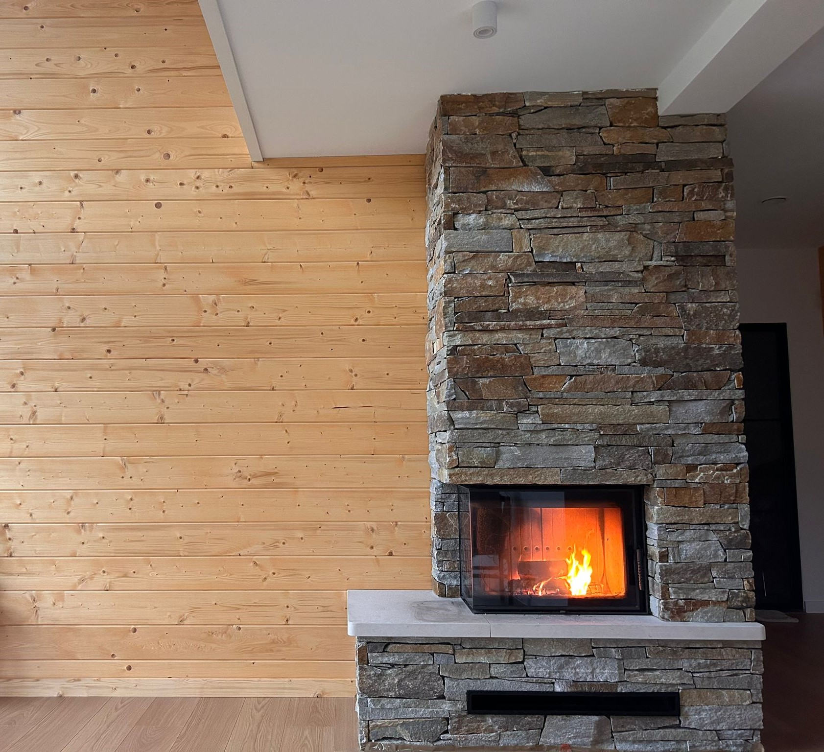 Kominek narożny z systemem DGP został wykończony naturalnym kamieniem.