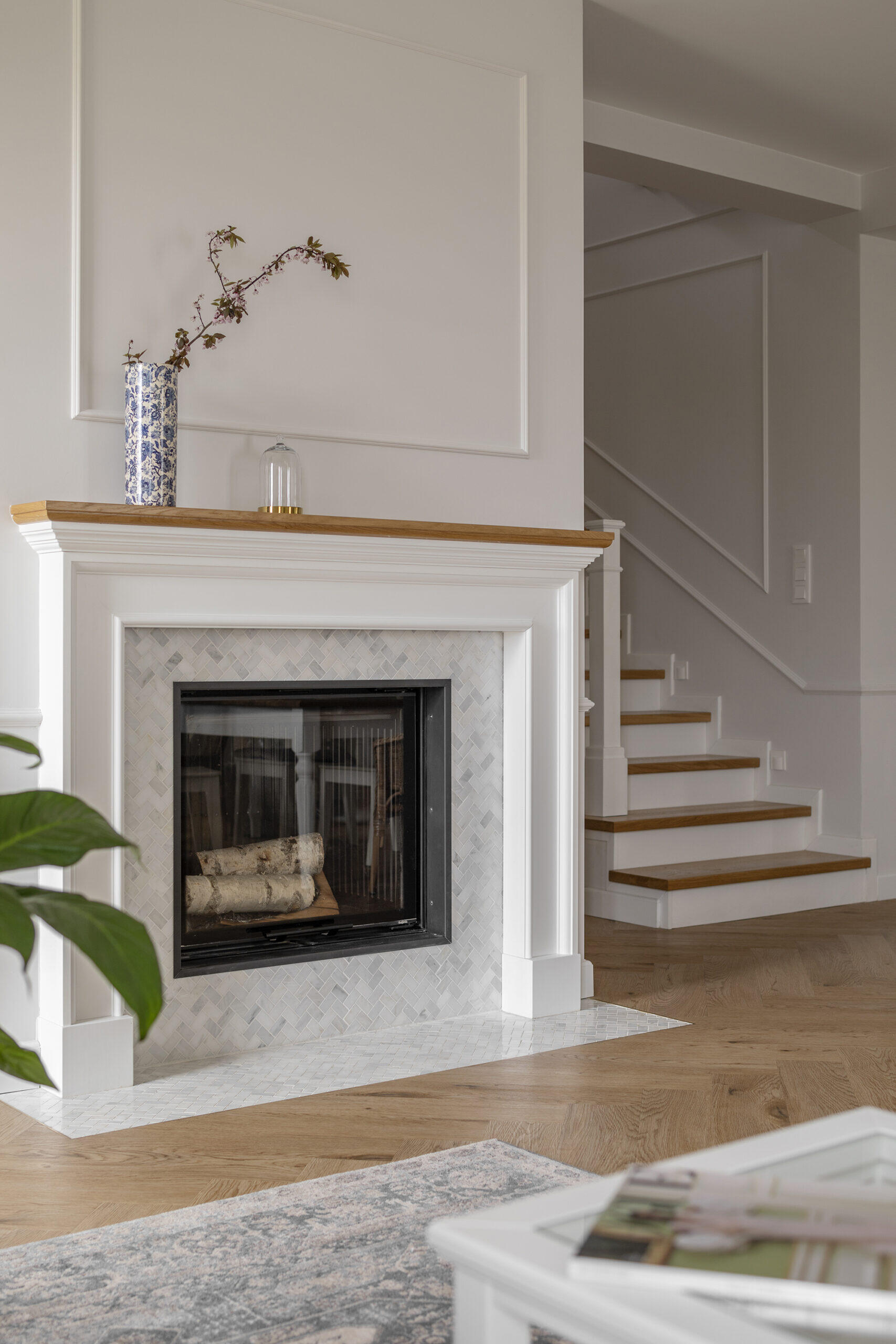 Kominek wykończony jest kaflami w kolorze arktycznej bieli z Kaflarni Kafel - Kar.