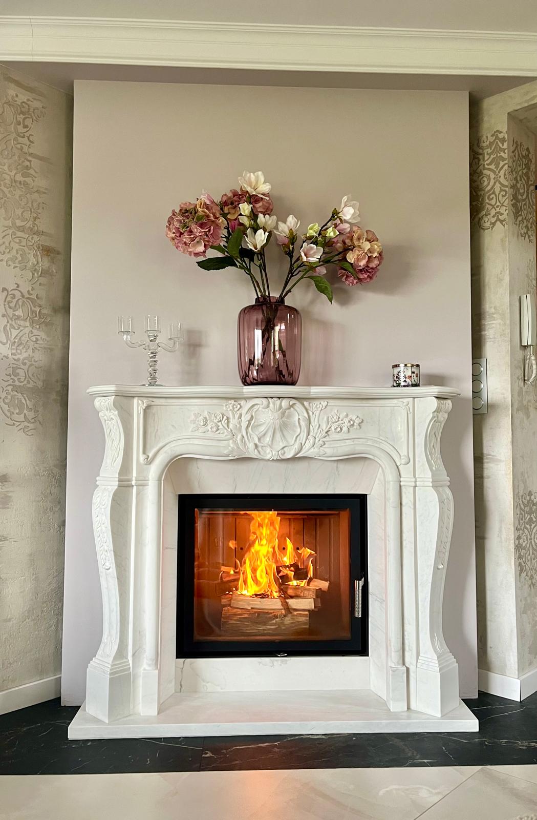 Kominek wykończony został portalem wykonanym z białego marmuru.