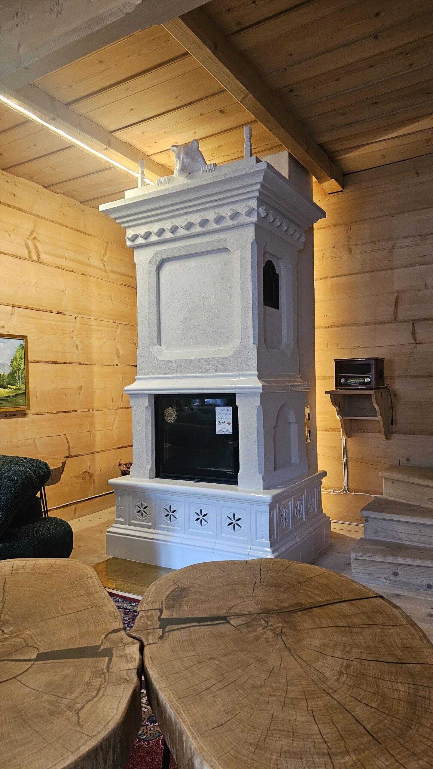 Kominek został zabudowany węgierskimi kaflami Koltocsempe w miejscowości Muszyna.