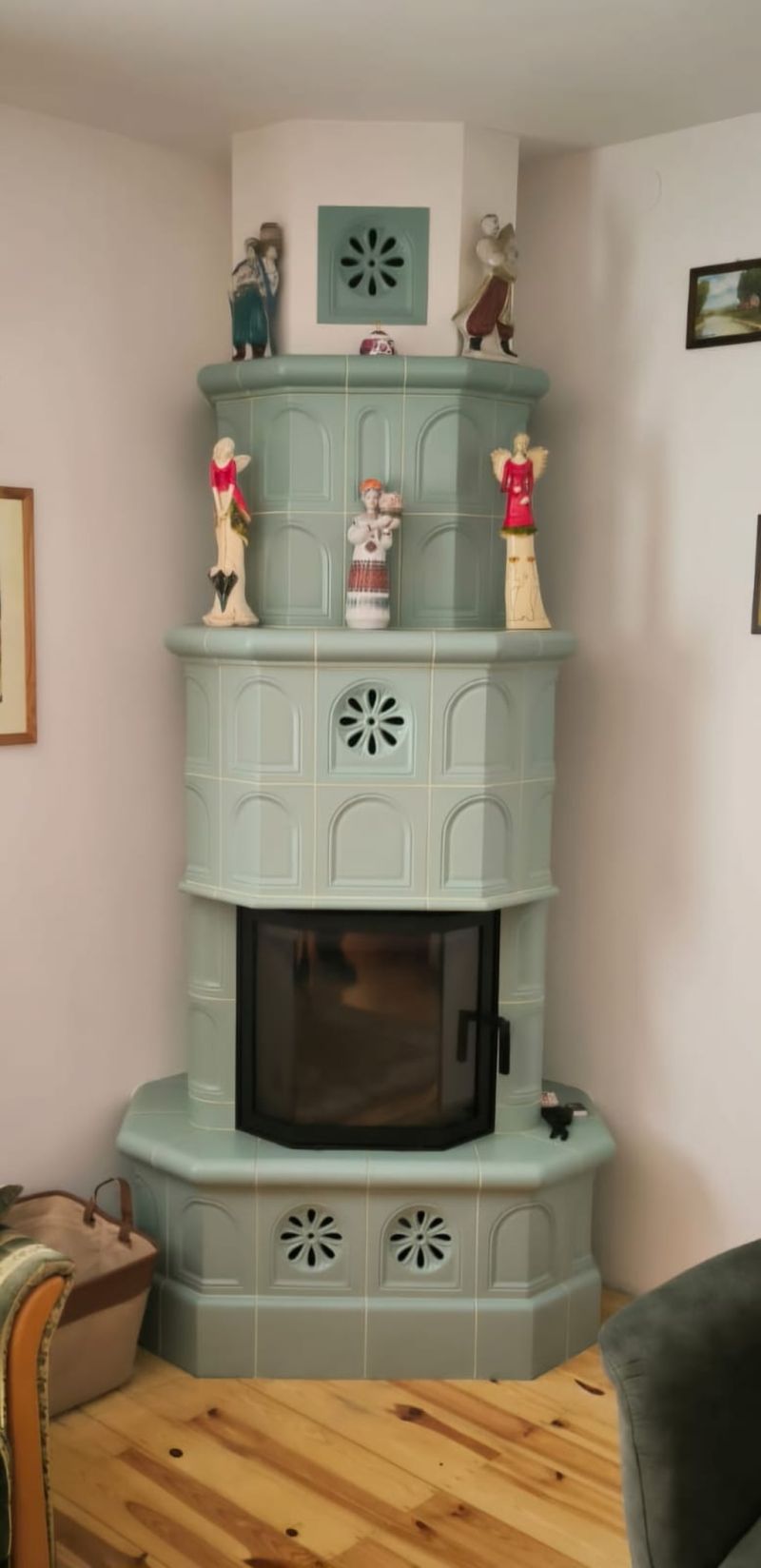 Kominek akumulacyjny z kawiarką nad paleniskiem. Wykończony został Kaflami z Kaflarni Kafel-Kar, w kolorze butelkowej zieleni i lnu transparentnego.
