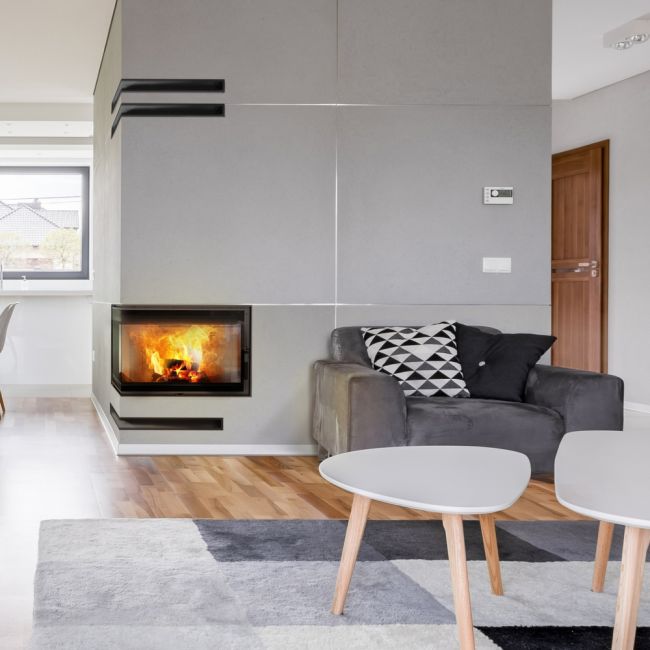 Minimalistyczna zabudowa dwuszybowego wkładu kominkowego z kratkami typu luft. Aranżacja kominkowego wkładu narożnego.