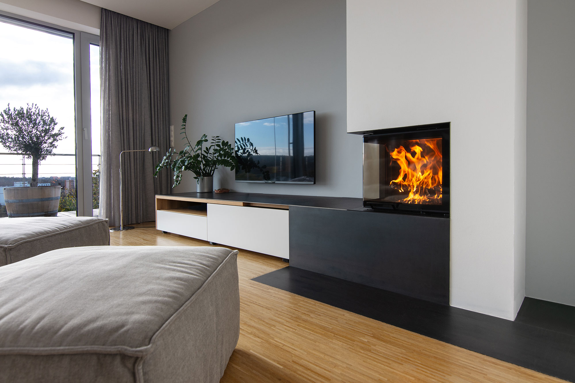 Minimalistyczna zabudowa narożnego wkładu kominkowego na drewno wykorzystująca czerń i biel. Blat pod paleniskiem przedłużony jest tworząc atrakcyjną i integralną szafkę RTV. To ciekawy pomysł na aranżację wkładu kominkowego z szybą w kształcie litery L.